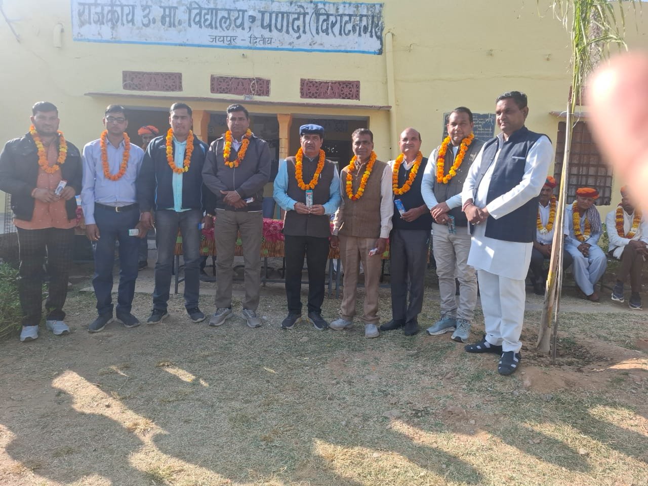 विराट नगर विधानसभा क्षेत्र में राजकीय उच्च माध्यमिक विद्यालय पण्दो में प्रधानाचार्य डॉ.परमानंद शर्मा की अध्यक्षता में राजकीय सेवा में चयनित विद्यालय के विद्यार्थियों का स्वागत स्वागत अभिनंदन किया गया भामाशाह श्री बाबूलाल पोसवाल के द्वारा चार चयनित विद्यालय के पूर्व विद्यार्थियों रौनक गुर्जर नीट मे चयनित राहुल गुर्जर शिवराम गुर्जर अग्नि वीर पद सेवा में चयनित प्रदीप धान का सीआरपीएफ में चयनित चारों को श्री भामाशाह बाबूलाल पोसवाल द्वारा प्रत्येक को ₹2100₹माल्यार्पण एवं साफा पहनाकर सम्मान कर पारितोषिक दिया गया प्रधानाचार्य डॉ.परमानंद शर्मा ने आगंतुकों का स्वागत अभिनंदन किया विद्यालय में अध्यनरत पूर्व छात्र जो राजकीय सेवाओं में चयनित हुए हैं को मंगल कामना ज्ञापित की इस मौके पर चयनित विद्यार्थियों का संपूर्ण गांव में जुलूस निकाला गया गाजे बाजे के साथ ग्रामीणों ने चयनित युवाओं का माल्यार्पण कर स्वागत किया इस अवसर पर श्री जगदीश प्रसाद बुनकर रवि कुमार मीणा श्री सुल्तान राम गुर्जर श्री योगेश बुनकर श्री अमिताभ बैरवा श्री राजेश असवाल श्री राम किशोर यादव श्री राम जी लाल गुर्जर आदि शिक्षक गण मौजूद रहे राष्ट्रगान के साथ सम्मान समारोह का समापन हुआ